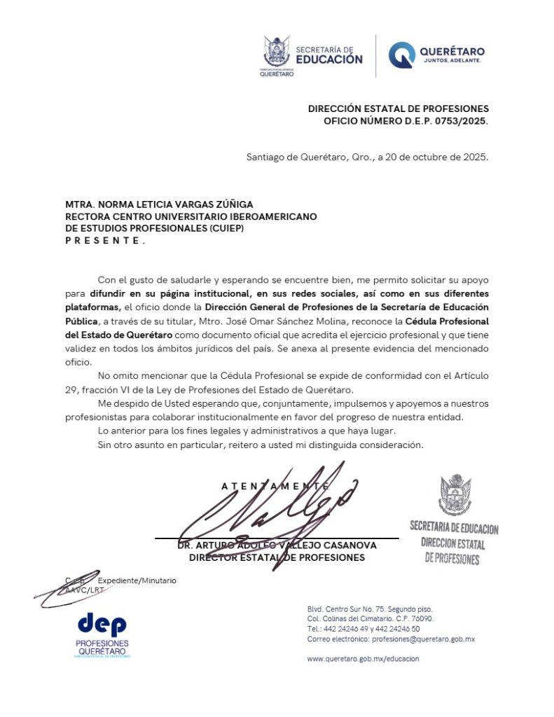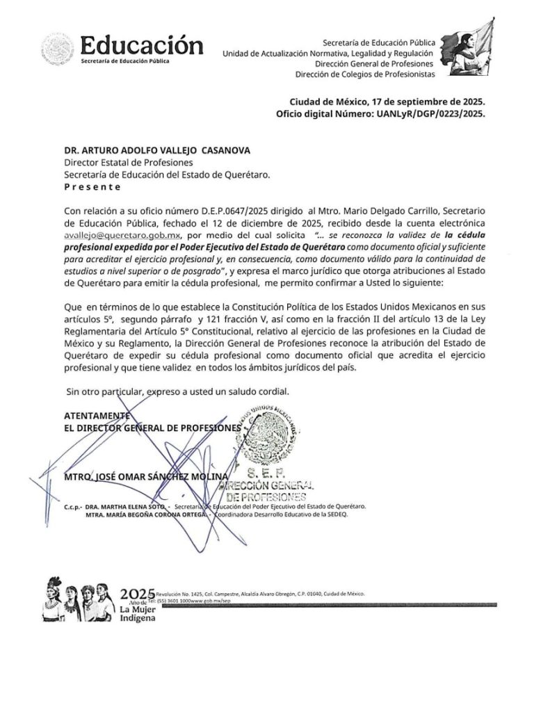 El documento emitido por la Secretaría de Educación Pública (SEP), a través de la Dirección General de Profesiones, con fecha 17 de septiembre de 2025, está dirigido al Director Estatal de Profesiones de Querétaro, Dr. Arturo Adolfo Vallejo Casanova.